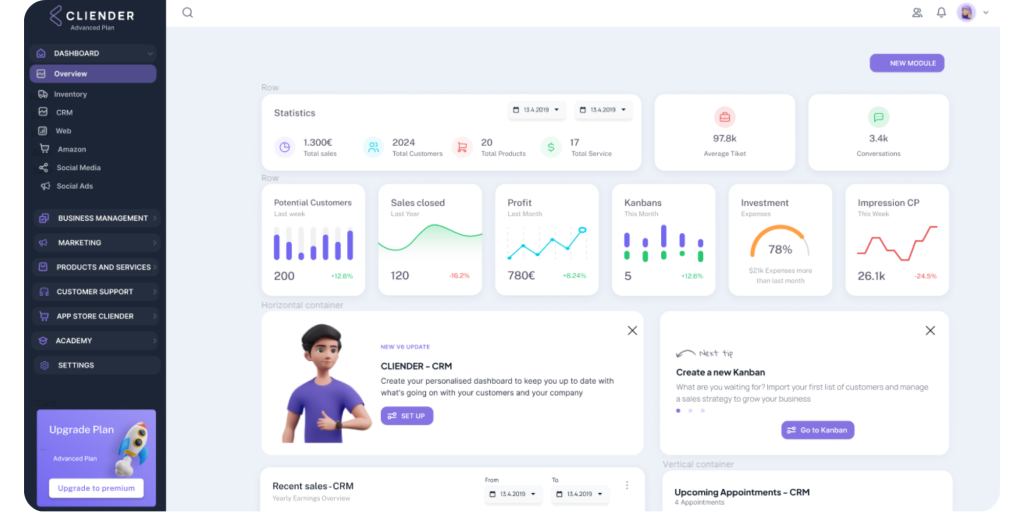 En un vistazo, monitoriza citas, facturación, clientes potenciales, desempeño de empleados y métricas sociales.